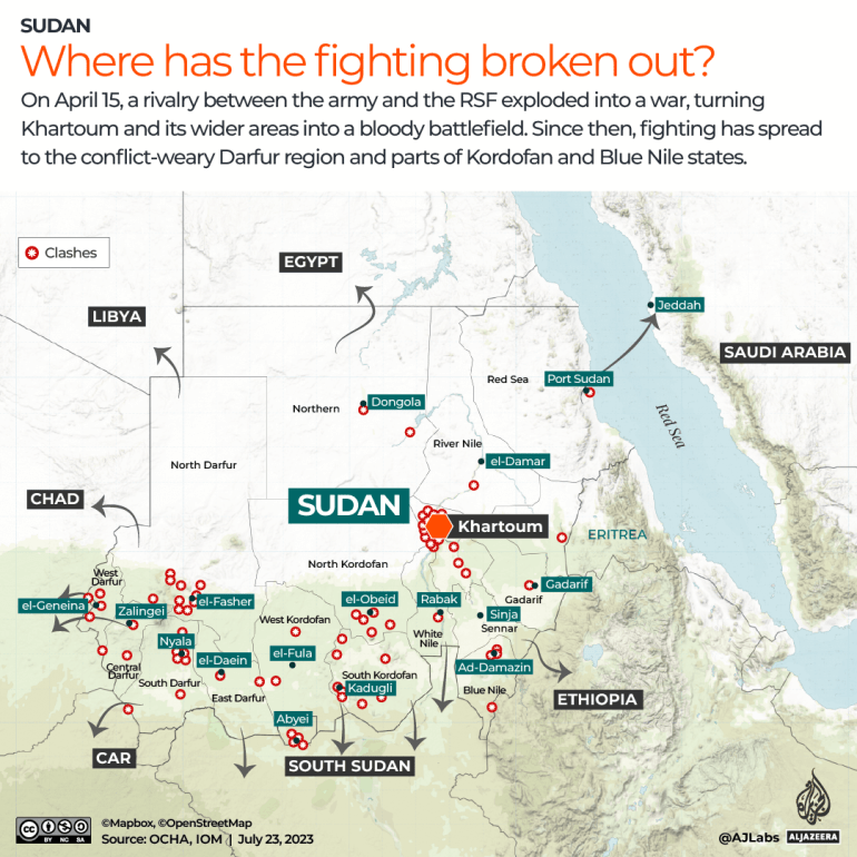 On April 15, a rivalry between the army and the paramilitary Rapid Support Forces (RSF) exploded into war, turning Khartoum and wider areas of the capital into a bloody battlefield. Since then, fighting has also spread to the conflict-weary Darfur region as well as parts of Kordofan and Blue Nile states.